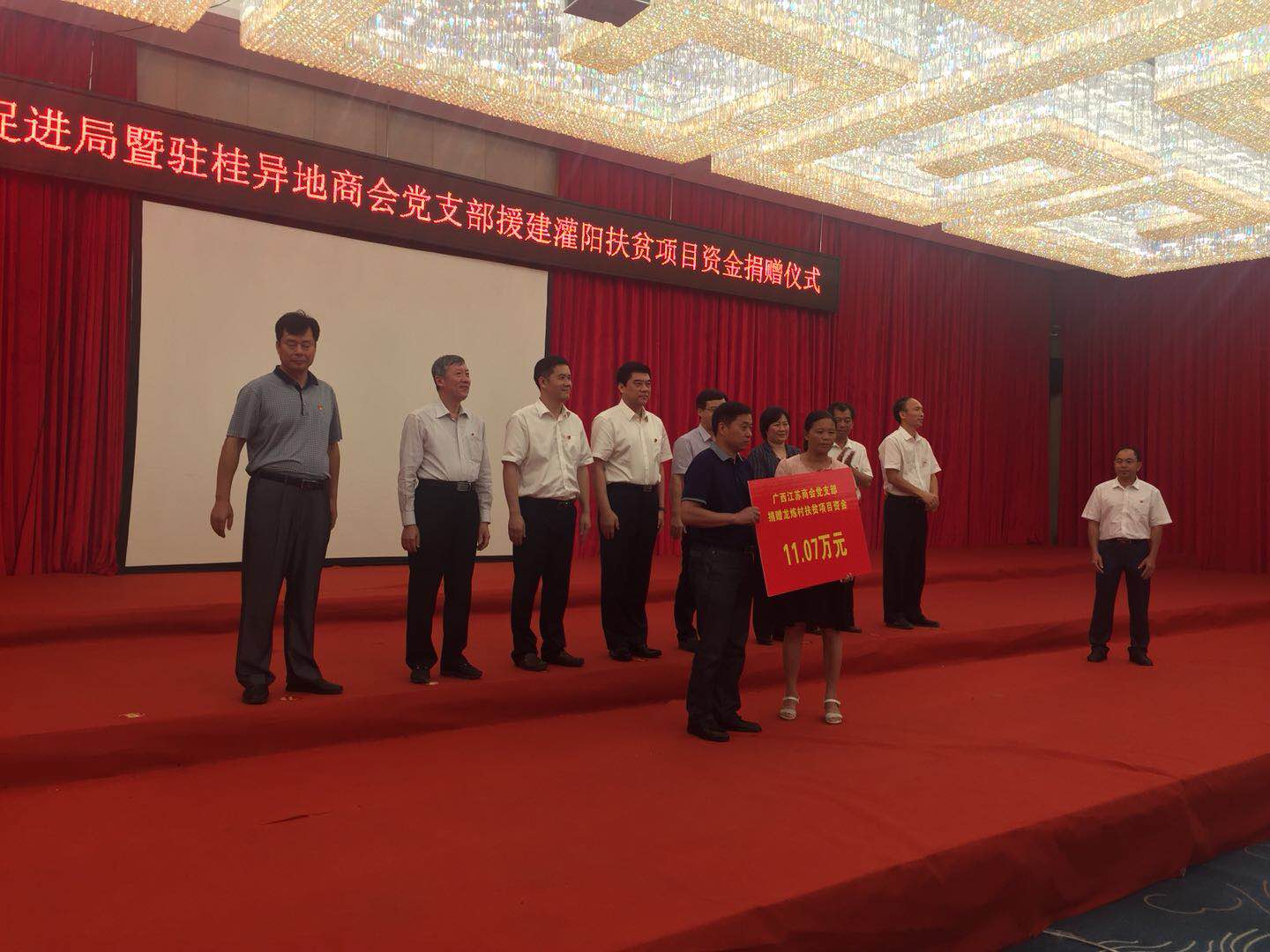 6月28日,即"七一”建党97周年前夕,我商会会长朱岳兵,执行会长施瑞明,秘书长朱建平,常务副会长易中山、鲍国平,副会长王月霞、朱俊杰、赵玉清、杜红方、李金波、万洪亚参加了桂林市灌阳县"党旗下行动"扶贫改坚活动,由商会认捐2个帮扶项目,出资共17.43万元,用实际行动铨释了共产党的组织要"一切以人民为中心”的宗旨,彰显了共产党员"一切为了人民”的初心,也用最务实的行动向党的97年华诞献上一份心意!